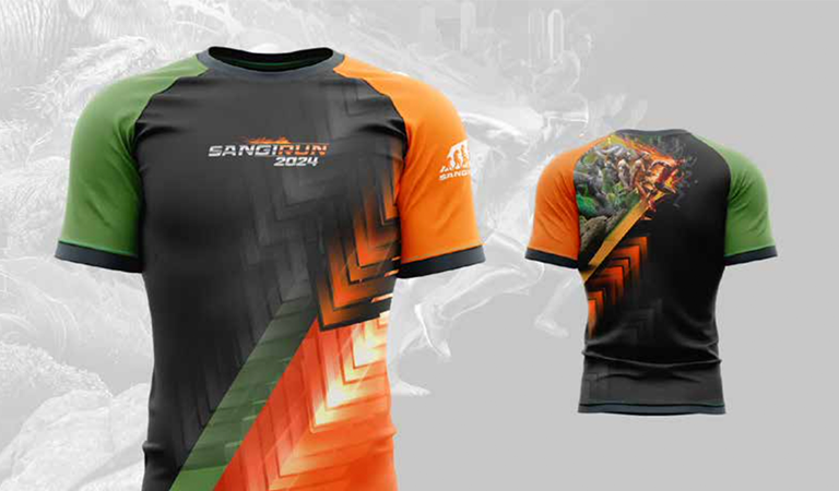 Untuk acara lari utama, Gantha Studio merancang desain kaos resmi SANGIRUN. Desain dibuat dengan gaya modern yang tetap memadukan unsur budaya, sehingga peserta tidak hanya merasa nyaman saat berlari, tetapi juga membawa identitas visual yang kuat sebagai kenang-kenangan dari event ini.